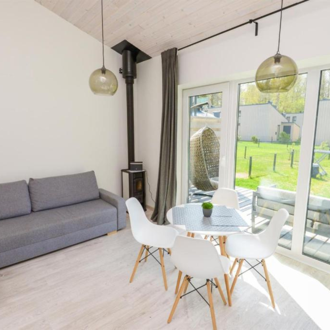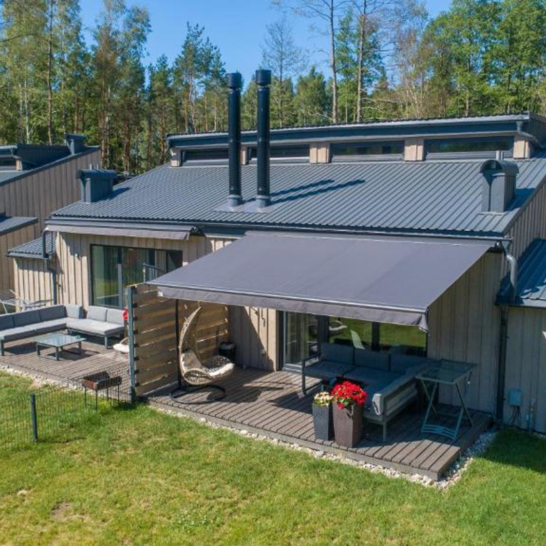 Kiekvienam nameliui priklauso privati, pilnai įrengta lauko terasa su patogiais baldais ir kepsnine. Už jos – jaukus uždaras kiemelis su žalia pievute. Visa teritorija saugi, aptverta, su automobilių stovėjimo vietomis ir pritaikyta judėti neįgaliesiems.